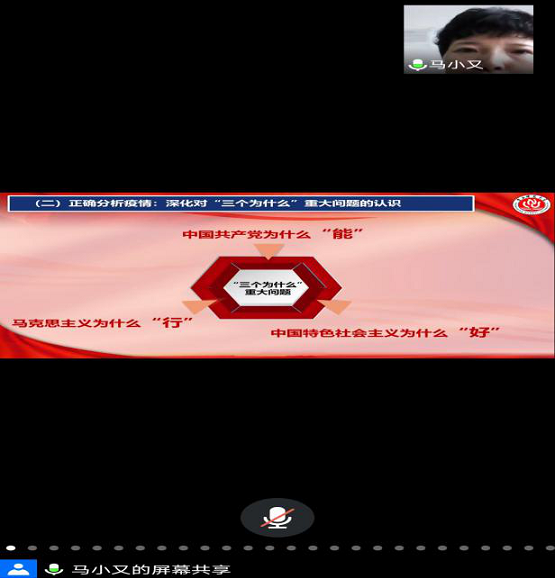 线上主题思政课在腾讯会议平台正式开课,本次课程主要面向学院本科2016级、2017级学生,课程主讲人为学院团总支书记、学工办主任、2017级辅导员马小又老师。马小又老师从以下四个方面进行了授课: