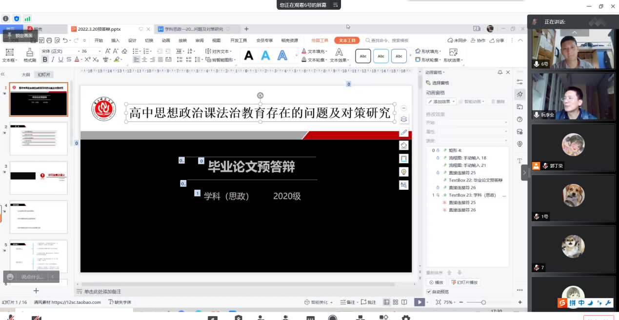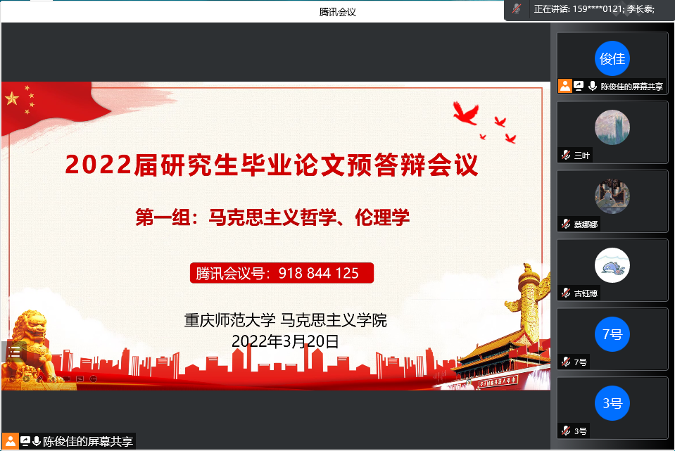 根据属地疫情防控有关要求,我校大学城校区实行封闭式管理。为加强对毕业研究生学位论文的指导和管理,切实提高研究生培养质量,学院认真贯彻落实教育部和学校工作要求,努力做到研究生学位论文与学位授予工作质量不降、标准不变、程序规范、形式便利。根据学校相关要求,2022年3月20日,成人网 通过腾讯会议分别开展了2022届马克思主义理论类、哲学类学术型研究生和学科教学(思政)专业学位研究生的学位论文线上预答辩工作。会议分上下午两场,共12个小组,预答辩学生总人数为79人。