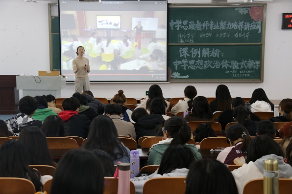 2019年11月15日下午,成人网 举办了中学思想政治教师专业能力培养系列讲座第二讲,邀请教育部“一师一优课,一课一名师”活动“优课”评审专家、重庆市骨干教师、西南大学卓越教师培养导师、重庆求精中学政治教研组长、成人网 1992级校友代豫军在砺志楼2315教室为学院2017级思想政治教育本科生带来了一场题为“体验式教学与高中思政课”的专题讲座。讲座由学院副院长况明安主持。