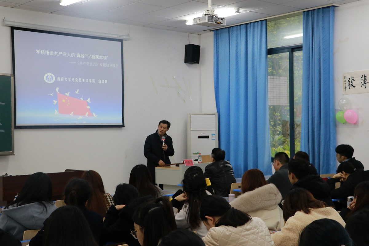 2019年11月26日下午,西南大学成人网 院长、博导、青年“长江学者”白显良教授应成人网 邀请到汇贤楼X106教室做题为“学精悟透共产党人的‘真经’与‘看家本领’——《共产党宣言》专题辅导报告”的专题讲座。成人网 全体研究生和部分教师共同聆听讲座。讲座由成人网 院长陈洪教授主持。