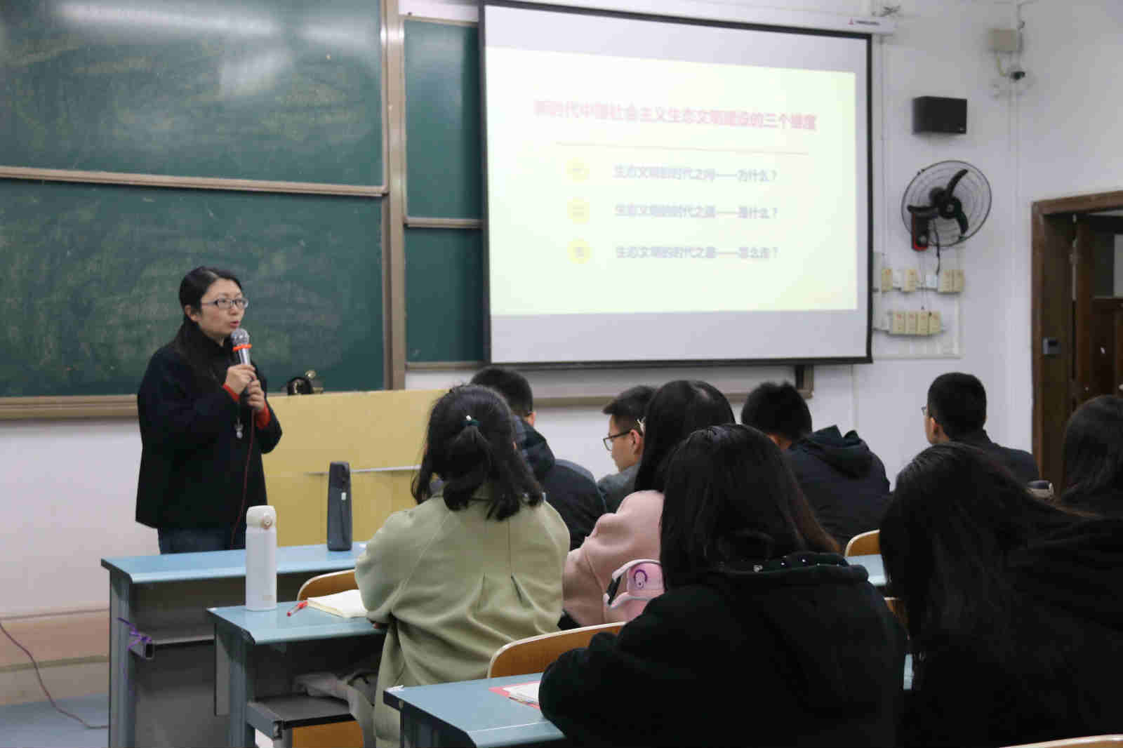 兰桂萍副教授从“生态文明建设的时代之问”、“生态文明建设的时代之蕴”和“生态文明建设的时代之路”三个方面进行讲解。首先,兰桂萍副教授列举了工业革命以来人类社会所产生的污染问题并引入主题,着重强调当前生态与文明之间的关系是:生态兴则文明兴,生态衰则文明衰。紧接着,她提出生态文明建设的时代之蕴具有两方面含义:文明形态的“演化式”——生态文明是对工业文明的超越和文明要素“结构式”——生态文明是一种整体文明构成。最后,在“生态文明建设的时代之路”中,兰桂萍副教授从前提、内核、重点和路径入手,指出应坚持:尊重自然、顺应自然和保护自然的三个理念;人与自然和谐共生、绿水青山就是金山银山等八个原则;生态文化体系、生态经济体系等五个体系以及加快构建生态文明体系、全面推动绿色发展等五点要求。