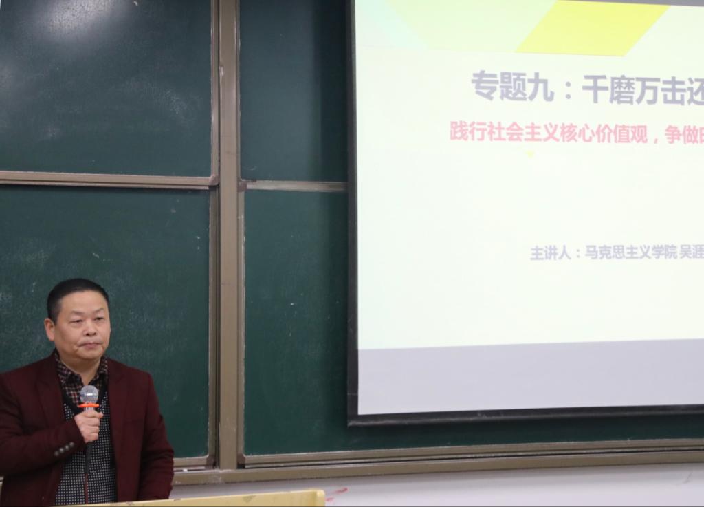教吴涯副教授主讲,主题是“千磨万击还坚韧:践行社会主义核心价值观,争做时代弄潮儿”。讲座由学院副院长况明安主持。