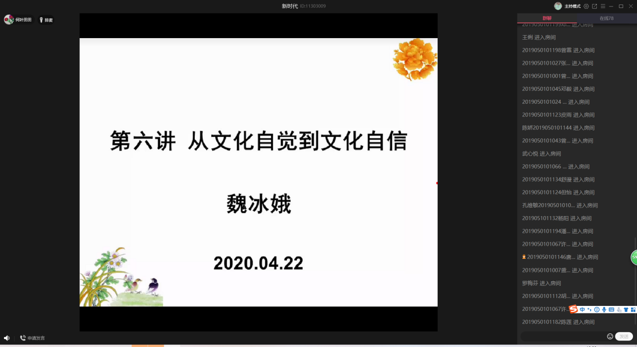 魏冰娥教授主讲,讲课主题为“从文化自觉到文化自信”。本次授课采用了QQ群课堂直播的线上教学形式,选课同学按时、全部参与了此次线上教学活动。