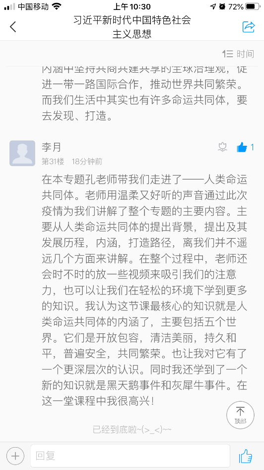通过本次课程,学生们对“人类命运共同体”有了更深的了解,有利于培养国际视野,并且有利于促进同学之间、师生之间和谐相处。本次讲课,孔老师备课充分,制作精美的PPT与视频相结合,课堂气氛活跃,讲课语言诙谐有趣、慷慨激昂,深受同学们欢迎。课后,同学们纷纷在网络平台上表达自己的看法。