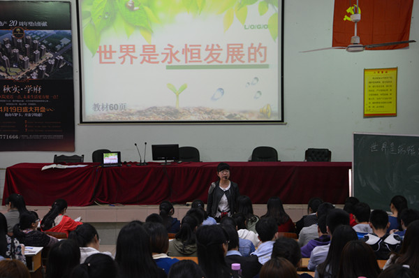 随后,荣获重庆市思想品德优质课赛课比赛二等奖的唐蕊老师带来了《世界是永恒的》一课。她通过璧山新旧公园的变化和从学生身边的小事说起,引出本课知识点“发展”。唐老师通过图示的方法讲授发展的实质和本课的重点——自然界是发展的,人类社会是发展的,人的认识是发展的。在场同学认真观摩老师们的献课,认真做好笔记。
