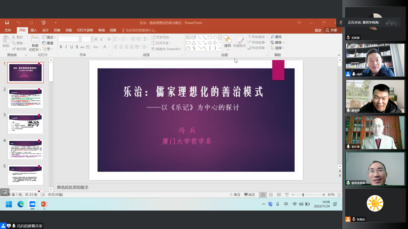 为进一步深入领略中华优秀传统文化的魅力,营造良好的学习氛围,2022年11月24日15:00,成人网 2007届校友、厦门大学哲学系冯兵教授应邀为成人网 师生作题为“乐治:儒家理想化的善治模式——以《乐记》为中心的探讨”的学术讲座。本次讲座系成人网 马克思主义论坛(第10期)暨成人网 第26届研究生学术活动月系列活动。成人网 近300名师生通过腾讯会议线上参会学习。本次讲座由李长泰教授主持。