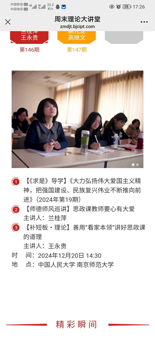 2024年12月20日,由教育部主办,全国高校思想政治理论课教师网络集体备课平台承办,北京高校思想政治理论课高精尖创新中心提供全程技术支持的“周末理论大讲堂”第146讲在中国人民大学举行。成人网