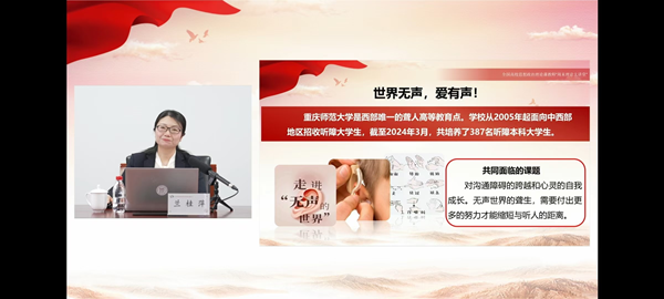 这一西部唯一拥有聋人高等教育的学校,思政课教师如何努力过手语关、上互助课、做引路人,让爱跨越声音的界限,引领聋生向阳生长的动人故事。她强调,思政课教师要将爱心汇聚成助力思政事业发展的责任担当,要善于联动思政小课堂和社会大课堂,守正创新谱写思政教育新篇章。兰桂萍老师表示:“教育就是爱的传递,一名思政课教师就是一面旗帜,我们自己哪怕只是散发微光,也要照亮身边人,汇聚同行者,将理想信念根植于学生心中,启智润心、铸魂育人,努力践行和诠释一名思政课教师的初心和大爱。”