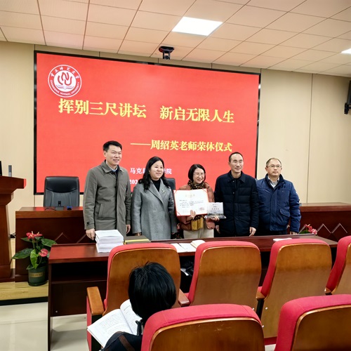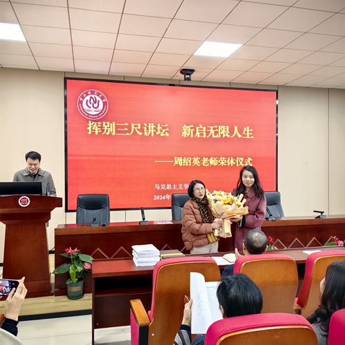 随后,周绍英老师发表了三点感言。第一, 对32年来参与并见证了马院跨越式发展,看到马院如今取得的成就感到非常荣幸;第二,对自己兢兢业业几十年如一日站稳讲台,无愧学生,无愧这份光荣的教育事业感到自豪;第三,感谢历届领导及老师们对自己的关心关怀,退休后依然会关心和关注马院的发展,祝愿学院在领导班子的带领下走向更加辉煌的明天!
