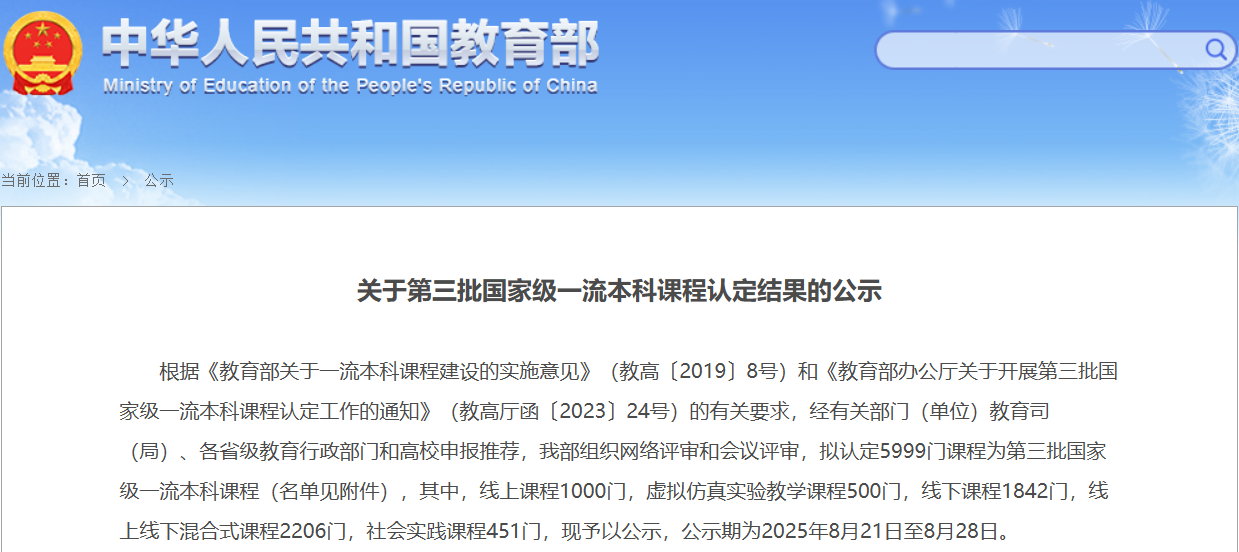 此次公示是教育部实施一流本科课程“双万计划”以来推出的第三批国家级一流本科课程。此前,成人网