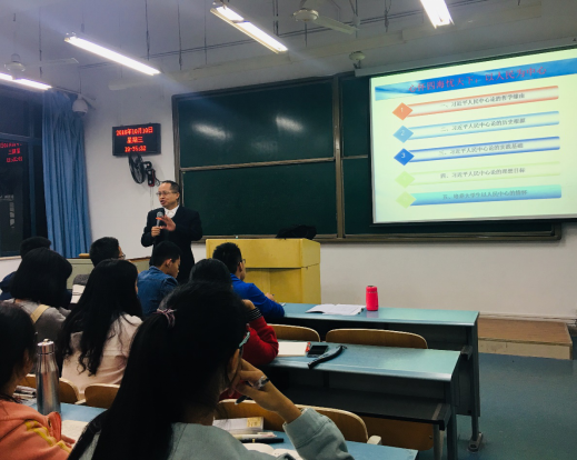 李长泰教授围绕习近平人民中心论的哲学缘由、历史根源、实践基础、理想目标、培养大学生以人民为中心的情怀等五个方面为同学们进行了详细深入讲解。他以比较毛泽东和蒋介石为切入点,风趣幽默地引入“以人民为中心”的主题。随后,他从全面从严治党、实战治军、生态保护、新时代理念、文化自信和制度执行等六个角度介绍了习近平总书记治国理政的六大亮点,并从习近平总书记在陕北七年知青岁月的经历介绍了总书记的人民情怀。随后,李长泰教授引经据典并结合自身实际为同学们详细讲解了习近平人民中心论的唯物史观哲学缘由、道统传承历史根源、人民力量的实践基础、人民理想:幸福生活的理想目标。最后,希望同学们应有以人民为中心的情怀,做到亲民至善,深入乡村基层街道社区搞调查研究,到乡村街道基层、艰苦地方、偏远地区工作锤炼,到祖国最需要的地方明志。