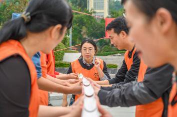 上午10点,在简短的开营仪式后,拓展教练通过报数方式将参训人员分成两组,并要求队员起队名、做队旗、研究团队留影造型等。通过集思广益,最后产生了口号为“好嗨好嗨,永不言败”的好嗨队和 “心向太阳,永放光芒”的太阳队。