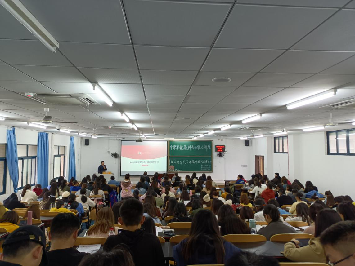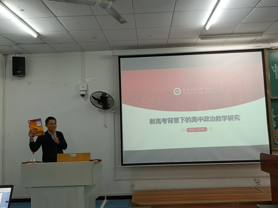 举办中学思想政治专业能力培养系列讲座第三讲,邀请重庆八中政治教研组组长,中学政治高级教师,重庆市骨干教师,重庆市高中政治学科名师靳万强老师在砺志楼2505为2018级思想政治教育专业本科生和2020级学科教学(思政)研究生带来一场题为“新高考背景下高中政治教学设计”的专题讲座。马克思主义学院副书记方敏为靳万强老师颁发聘书并主持本次讲座。