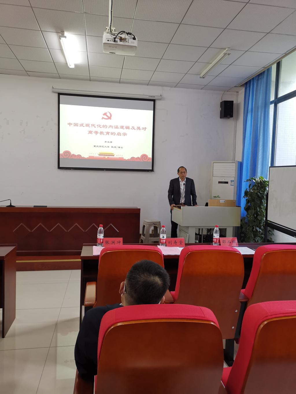 紧接着,李长泰教授以“中国式现代化的内涵逻辑及其对高等教育的启示”为题为大家展开了一场精彩的主题教育理论学习讲座。他从中国式现代化的民族内涵、文化内涵、科技内涵、政治内涵、人本内涵以及中国式现代化的高教启示六个方面清楚的向大家展示了中国式现代化的中国特色与本质要求。通过对五个内涵的把握,他表示,中国式现代化要以大学学生为本、以奋斗理想为本、以高等技能为本、以创新发展为本、以民族文化为本、以共同发展为本,加快提升国家的综合实力和竞争力,让中华民族强势屹立于世界民族之林。