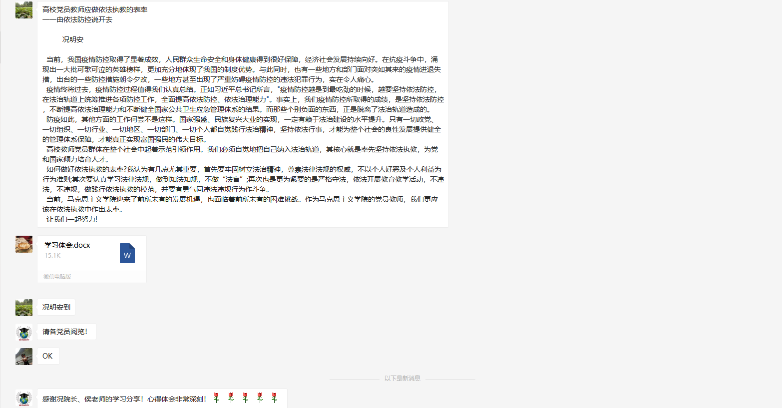 会议由支部书记李长泰教授主持,支部全体党员同志参加了此次交流。李长泰教授首先带领大家学习了“全面提高依法防控依法治理能力,健全国家公共卫生应急管理体系”重要文章,他指出应急管理体系建设主要包含法制范围内的应急管理体系和全方面范围下的应急管理体系。随后,支部党员畅所欲言,大家纷纷表态,一致认为,这次新型冠状病毒肺炎疫情是新中国成立以来防控难度最大的一次重大突发公共卫生事件,习近平总书记的重要讲话明确了健全国家公共卫生应急管理体系的总体原则、重点思路、重要举措,为坚决打赢疫情防控阻击战指明了方向。作为高校思政理论课教师党员,我们既要切实提高政治站位,把思想和行动统一到习近平总书记重要讲话精神上来,更要把抗击疫情精神落实到大学生思想政治教育中,上好这堂别开生面、凝聚人心的育人课。