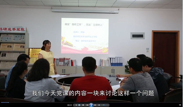 2020年9月24日,毛中特支部召开支部大会,支部书记郑瑜带领党员教师们再温习近平总书记的殷殷嘱托,从教师“隐形工作”做实入手,亮出教师“立德树人”的自信。这也是“双带头人”支部书记郑瑜工作室参选的一堂微党课。
