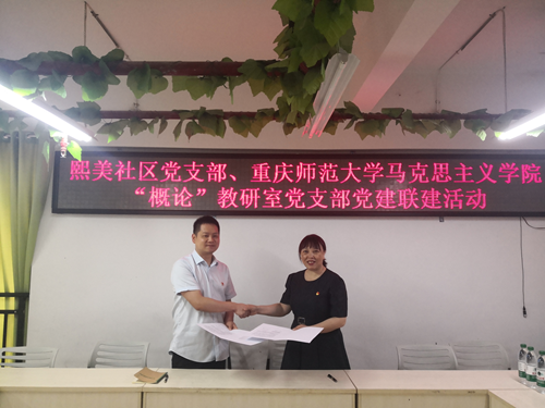首先,两位党支部书记分别介绍支部情况,并就党建联建提出合作方向。王毅书记介绍了熙美社区和社区党支部的基本情况和特点,对“概论”教研室党支部以往长期为社区提供的志愿服务给予了高度赞扬,并就党建联建的基础和条件等进行了说明。郑瑜书记介绍了“概论”教研室党支部的基本情况,回顾了党支部以往在社区、中小学等开展的党建合作成效,并就与熙美社区党支部开展党建联建共促社区治理和发展的合作目标和方向进行了说明和展望。在方敏副书记的见证下,双方在理论宣讲、社区服务等方面系列共识的基础上,郑瑜书记和王毅书记分别代表“概论”教研室党支部和熙美社区党支部签订了党建联建的合作协议。