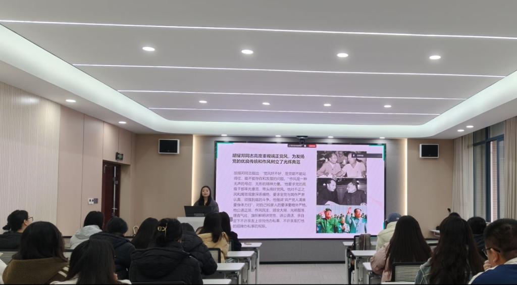 汇报结束后,支部书记程思捷老师作总结讲话。她提出两点要求:一是全体支部党员要将党的二十届四中全会精神内化于心、外化于行,紧密结合研究生阶段的学习科研任务,把学习成果转化为攻坚克难的实际行动,落实到具体工作岗位上;二是要始终严于律己,以胡耀邦同志等老一辈革命家为榜样,坚守廉洁自律底线,永葆共产党员的政治本色,在新时代新征程中展现青年党员的责任与担当。