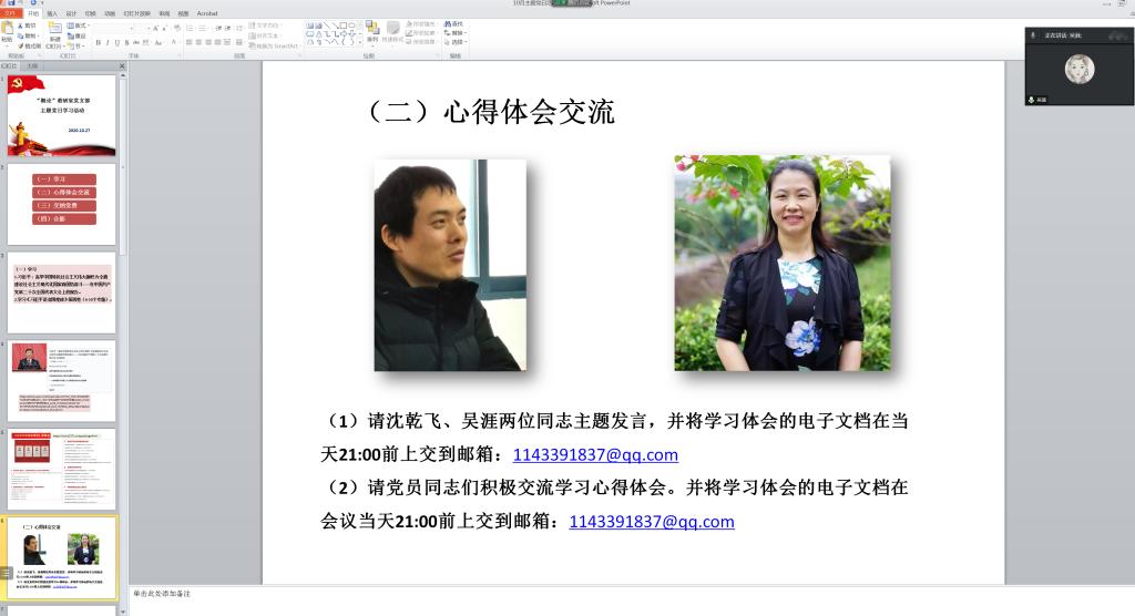 2022年10月27日中午1:00,“概论”教研室党支部通过腾讯会议召开线上支部党员大会,组织开展10月主题党日学习活动,重点学习了中国共产党第二十次全国代表大会报告和《习近平谈治国理政》第四卷第六至十专题的相关内容。会上,吴涯同志着重从新时代十年伟大成就、全过程人民民主的本质内涵和将二十大精神融入思政课教学三个方面交流了学习心得;沈乾飞同志重点就党员干部在实现中国式现代化中的关键作用以及如何更好推进党的自我革命等角度谈了学习体会;蓝天同志则围绕全面建设社会主义现代化强国的关键因素—科技和创新发表了学习感想。最后,支部书记郑瑜同志要求全体党员要持续深入学习二十大精神和习近平新时代中国特色社会主义思想,切实把其中的新理念、新提法、新论断全方位融入到思政课的课堂教学中,让党的最新理论成果及时进教案、进课堂、进学生头脑。
