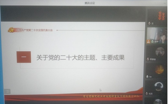 2022年11月24日14:00,“思法”支部利用腾讯会议开展二十大精神宣讲学习活动。支部书记杨桦同志围绕党的二十大报告的主题,为全体成员带来了一堂生动的高质量党课。