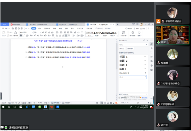 12月29日下午,研究生第二支部在腾讯会议上开展了本月主题党日活动。此次会议由徐琴书记主持,全体党员参会,聚焦中国式现代化道路和人类文明新形态两大主题进行了研讨。