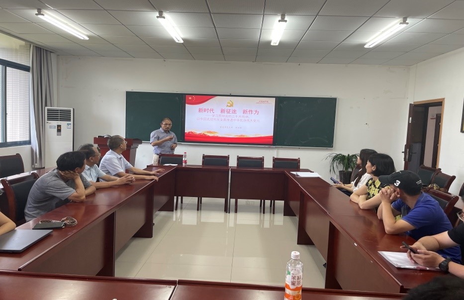 党委委员田方林教授在学院309会议室,以《新时代 新征途 新作为:学习贯彻党的二十大精神,以中国式现代化全面推进中华民族伟大复兴》为题讲授主题教育专题党课。原理支部全体同志参加了党课学习,支部书记李长泰主持专题党课。