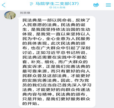 学生二支部委员会开展线上主题党日活动,活动包括两项议程:一是以“悟初心使命”毕业生党员主题活动及经典文献阅读,二是学习《民法典》谈心得感悟。参加本次会议的人员有中共成人网