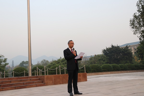 升国旗仪式结束,活动进入第二阶段,学院党委书记刘军作国旗下讲话。