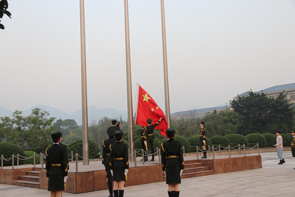 活动第一阶段:升国旗仪式。7时35分,学院师生于正校门广场列队完毕。学校国旗护卫队队员雄姿英发,迎着朝阳,迈着整齐稳健的步伐护送国旗走向升旗台。《义勇军进行曲》奏响,全体师生们肃立,齐声高唱国歌,向冉冉升起的五星红旗行注目礼。