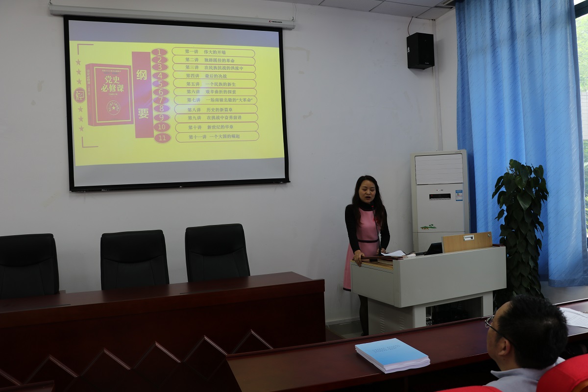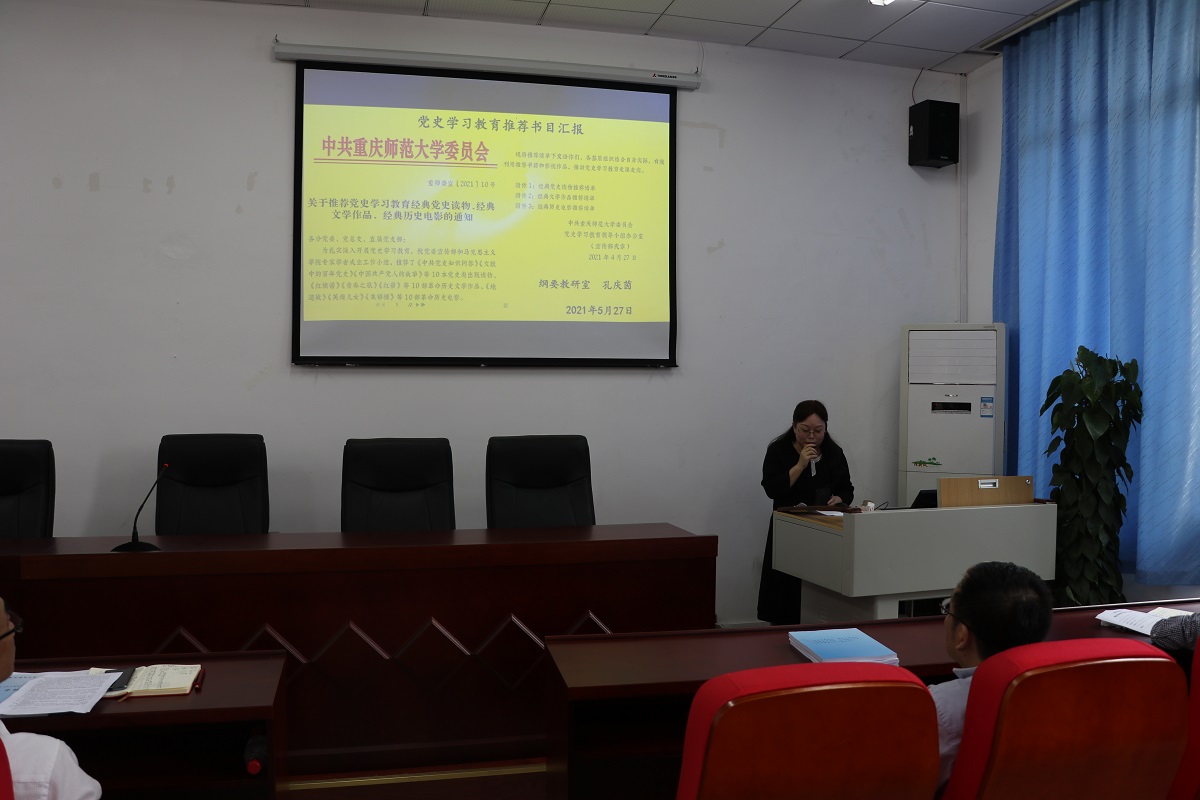 随后,学院思想政治理论课教学部主任孔庆茵教授为大家介绍了今年党史学习教育中国近现代史纲要教研室向全校推荐十套经典党史书目情况。孔庆茵老师说:此次党史学习推荐书目从作者和内容无争议、有权威性和代表性、书目与党史相关、受众要广等方面进行了筛选,希望对大家深入学习和了解党史有更多的帮助。
