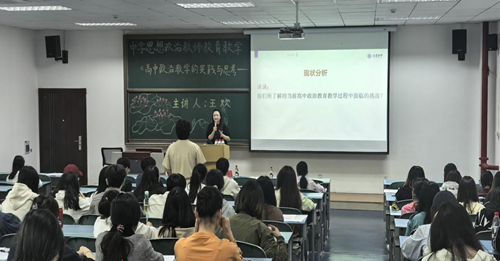 特邀巴蜀中学思想政治学科王欢老师,在求是楼213作题为“高中政治教学的实践与思考——与未来思政教师的对话”的讲座。讲座由学院政教系副主任彭君君博士主持,我院思想政治教育专业本科生和思政专业“协同提质计划”本科学生参加。
