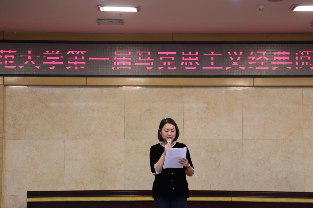 随后,党委宣传部党亚莲部长在讲话中指出,本次阅读报告会的举办,对于落实立德树人根本任务,引导广大青年学生深刻感悟马克思主义的真理力量和实践力量,促进马克思主义中国化、时代化、大众化,营造精读、深研经典的良好学习氛围具有重要意义。她指出,一是要深刻理解马克思主义的强大生命力和感召力;二是校院两级要以此次活动为契机,将马克思主义经典的学习教育贯彻到立德树人、“三全育人”工作始终;三是呼吁同学们能够坚定共产主义的远大理想和中国特色社会主义共同理想,努力成为坚定的青年马克思主义者。