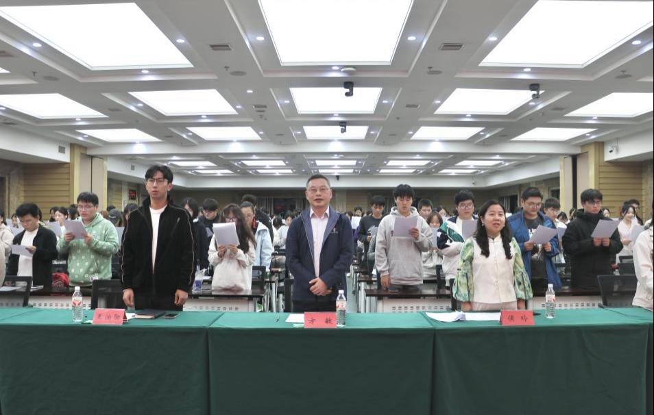 党委学工部思政科王泊勋及教师代表出席大会,2025级全体本科生及本、硕各年级学生代表到场参与学习。