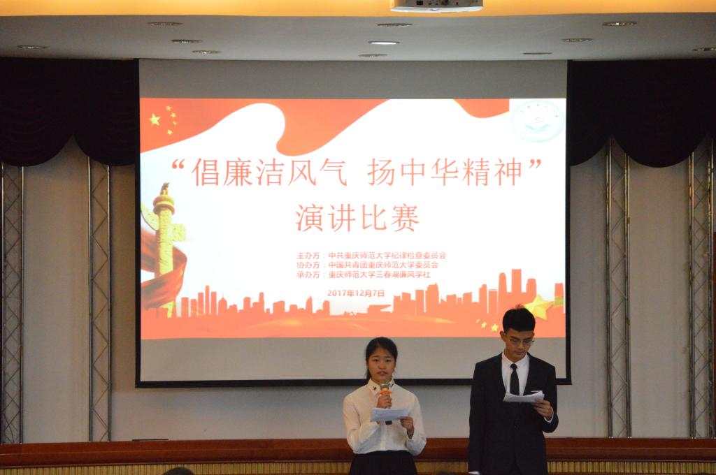 三春湖廉风学社承办。“倡廉洁风气,扬中华精神”廉洁演讲比赛决赛在弘德楼凯撒报告厅举行。本次活动特邀校团委书记毛霞,监察处副处长彭林,国际汉语文化教育管理办公室副主任左金隆,外国语学院党委副书记、纪委书记钟敏,音乐学院党委副书记、纪委书记文琪,纪委监察处正科级纪检监察员、三春湖廉风学社指导老师戴杰担任本次活动的评委。