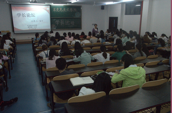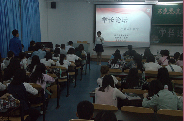2012级已成功签约的伍宁与考上华中科技大学研究生的甘功平分别于特教楼2410教室、弘德楼5201教室为2014级学子交流就业、考研相关经验。张晓庆老师组织2014级全体同学到场观摩学习。