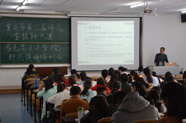 于励志楼2309教室举办重庆市第二届师范生技能大赛培训之即兴演讲培训会暨如何提高中学政治教学的有效性讲座。本次讲座邀请重庆八中的政治教研组组长靳万强老师担任主讲人,2012级全体同学参加。