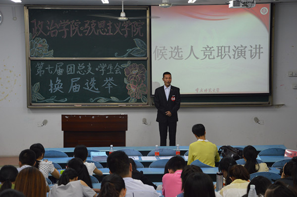 第七届团总支·学生会主席团换届选举。各候选人围绕竞选职位进行慷慨激昂、声情并茂的演讲,表达了自己愿意为同学服务的决心。九名选手竞职演讲后,现场观众本着公平公正公开的原则进行投票。