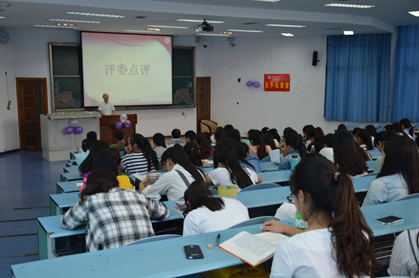 分党委副书记姜土生老师,祝玉峰教授、王建斌博士、邵二辉博士、赵艳华老师担任此次比赛的评委。2013级、2014级全体学生到现场观摩学习。
