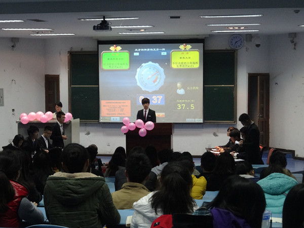 辩论赛伊始,主持人介绍比赛规则和程序,激情辩论正式拉开帷幕。本次辩论赛分为两场,第一场重庆科技学院(正方)与重庆大学(反方)狭路相逢,围绕“应不应该提倡在公共场所免费提供wifi”展开辩论。双方就什么是公共场所,免费提供wifi的背后承担者,提供wifi的原因、意义、作用等方面进行辩论,双方都据理力争,反应机敏。第二场重庆医科大学(正方)与成人网