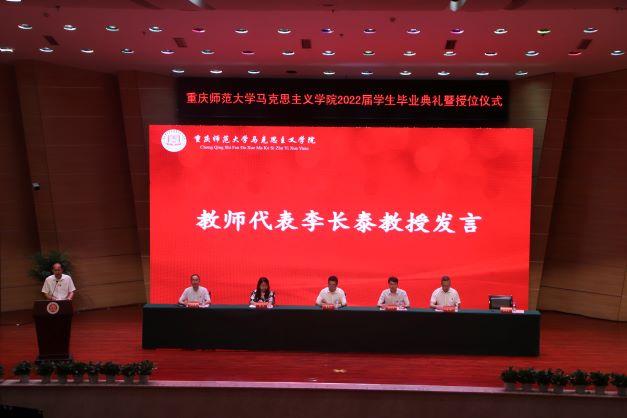 紧接着,教师代表李长泰教授发言:第一,同学们的马克思主义学习经历丰富了校史,拼搏奋斗的精神将永载校园史册;第二,同学们的工作深造将赓续和实践家国天下观,要始终以诚为本,以勤为路,学院将永远以同学们的努力为荣光;第三,面对未来,同学们应该树立崇高的理想和境界,心有多宽,发展的空间与格局就有多大。此外,李长泰教授以“修身齐家治国平天下”为引,向同学们提出三点要求:一是要多看书,培养浩然之气;二是要善于经受挫折,在困难和困苦中磨砺民族性格;三是要善于默默无闻、积累自身,做好自己的事情,服务家国天下。