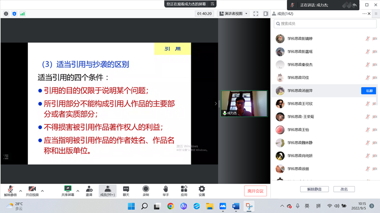 于2022年9月5日上午9:00-11:30开启了研究生新生入学教育,鉴于疫情形势和防疫要求,本次主题活动通过腾讯会议以线上的形式开展。姜土生副院长、2022级研究生班主任成力杰老师和徐琴老师为大家讲解入学教育的内容,21级研究生助理易梦秋同学主持会议,全体2022级研究生参会。