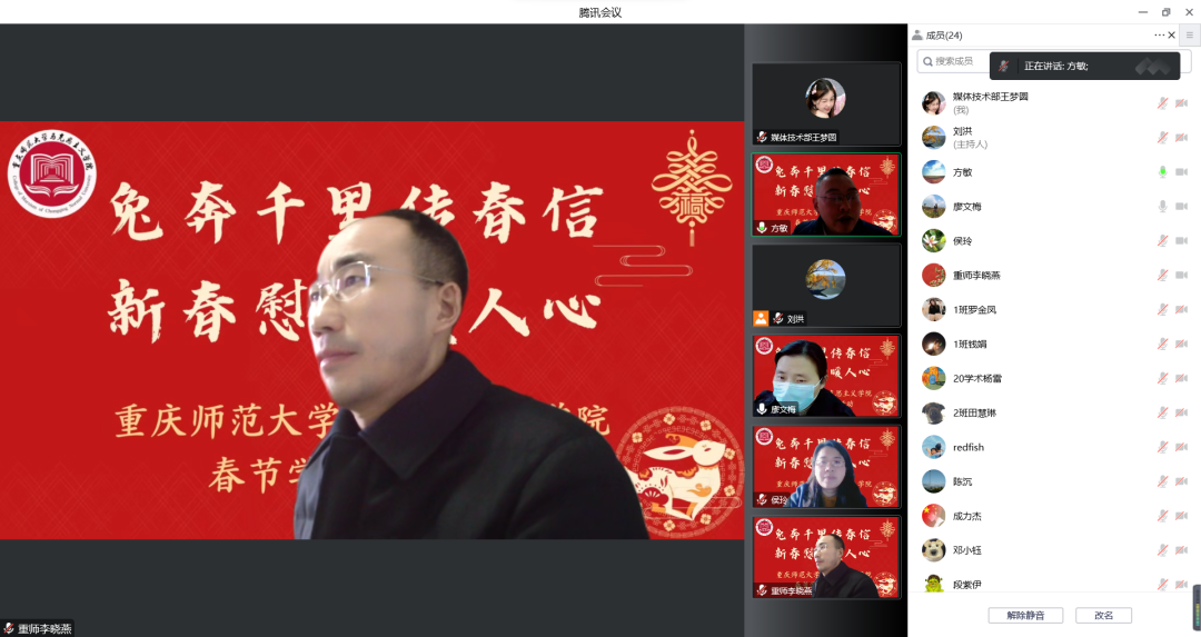 而后李晓燕书记进行总结发言。首先,他向大家表达了新春祝福和问候,并肯定了开展本次活动的重要意义:慰问活动既是学院的传统,也是加强和学生交流沟通以及关心、帮扶学生的一种方式,更是思想政治工作重要的载体和内容。其次,他指出,2022年学院取得的成绩与发展可圈可点,这些进步是大家共同努力的结果,他对此表达了诚挚感谢,并寄语同学们持续用心地学习、做好自己的本职工作,同时传播积极向上的正能量,不断发扬好的作风和品质,争做一名合格、优秀的马院学子。最后,李书记强调了安全问题,并再次送出新春祝福,希望大家以更好的状态迎接新的一年。