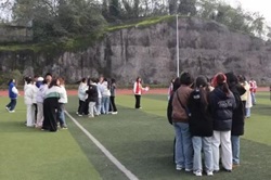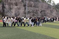 在三脚同盟比赛中,同组队友一人的左腿和另一人的右腿在脚踝附近用丝带捆绑联系,步伐一致向设定终点前进,按小组完成时间先后记分。在比赛开始前,每一个小组都积极地为这场团队协作的比赛出谋划策,并不断地尝试与练习。比赛正式开始,随着“一二,一二......”整齐有力的口号声的响起,同学们尽管在一开始脚步踉跄,也会迅速被同伴扶住,继续前行,充分展现团结协作的力量与友爱和谐的氛围。