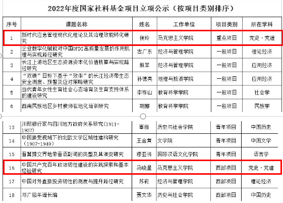 副院长侯玲教授申报的“新时代应急管理现代化理论及其治理效能转化研究”获批2022年度国家社科基金重点项目;马晓星博士申报的“中国共产党百年政治韧性建设的实践探索和基本经验研究”获批2022年度国家社科基金西部项目,为学院科学研究和学科建设提供了重要的支持。
