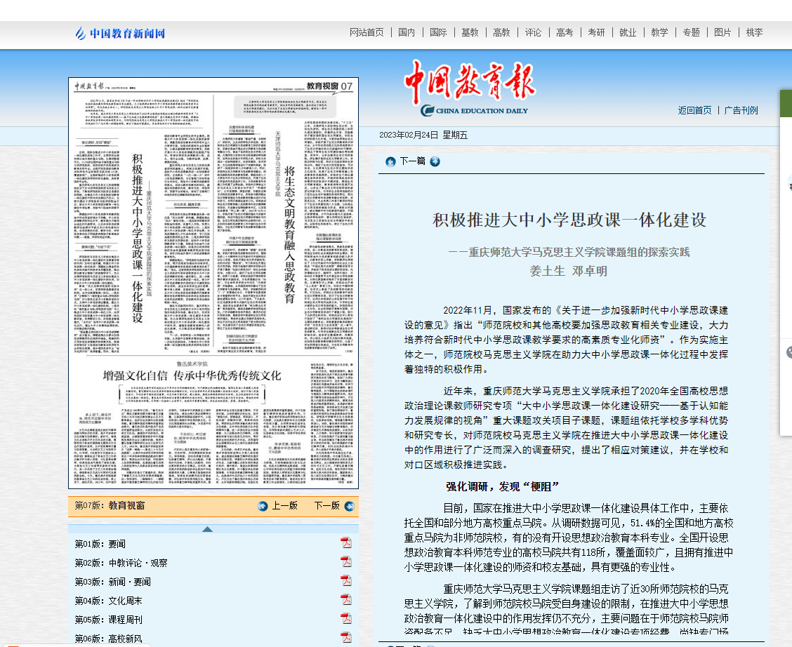 中国教育报:积极推进大中小学思政课一体化建设——成人网 课题组的探索实践