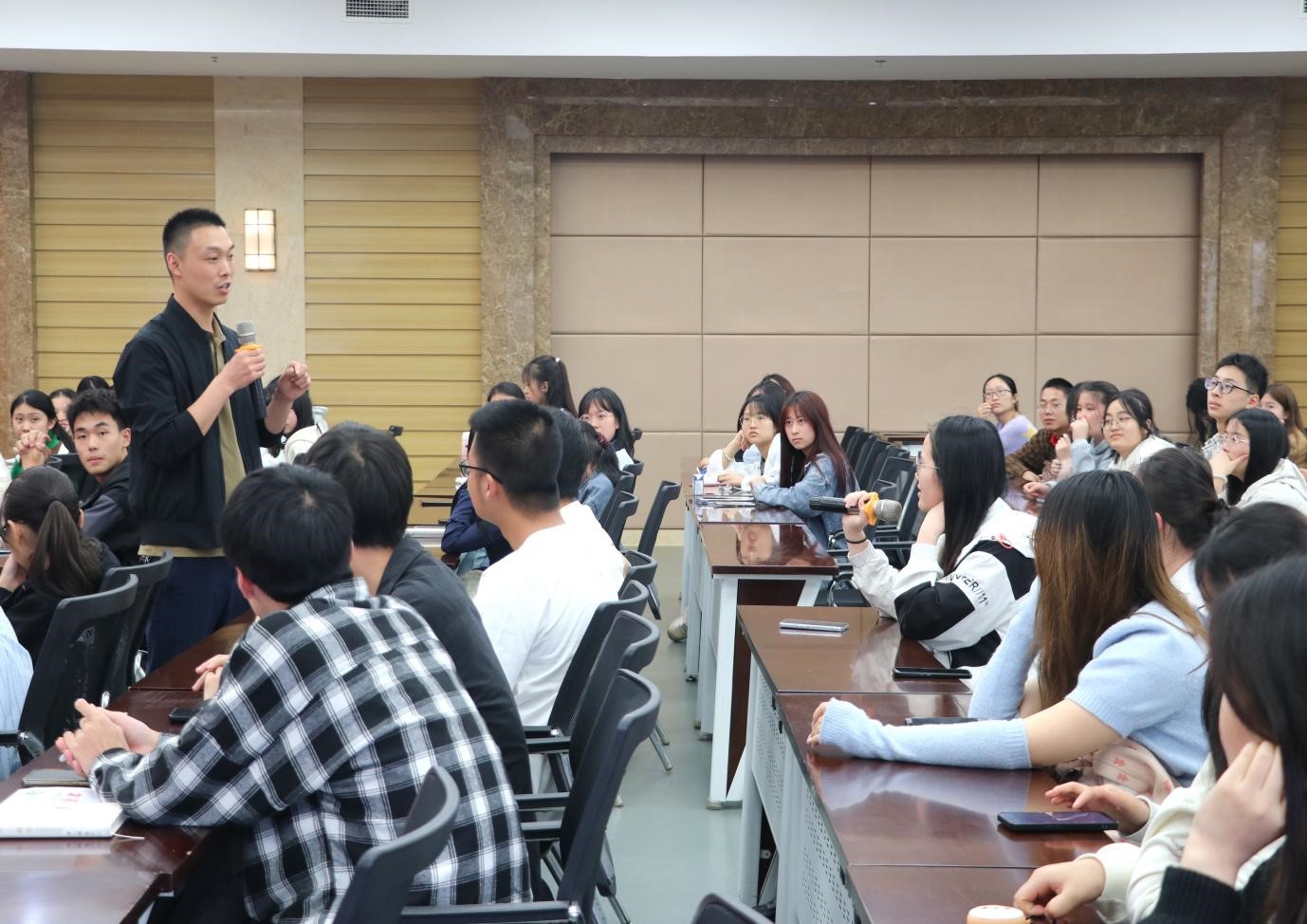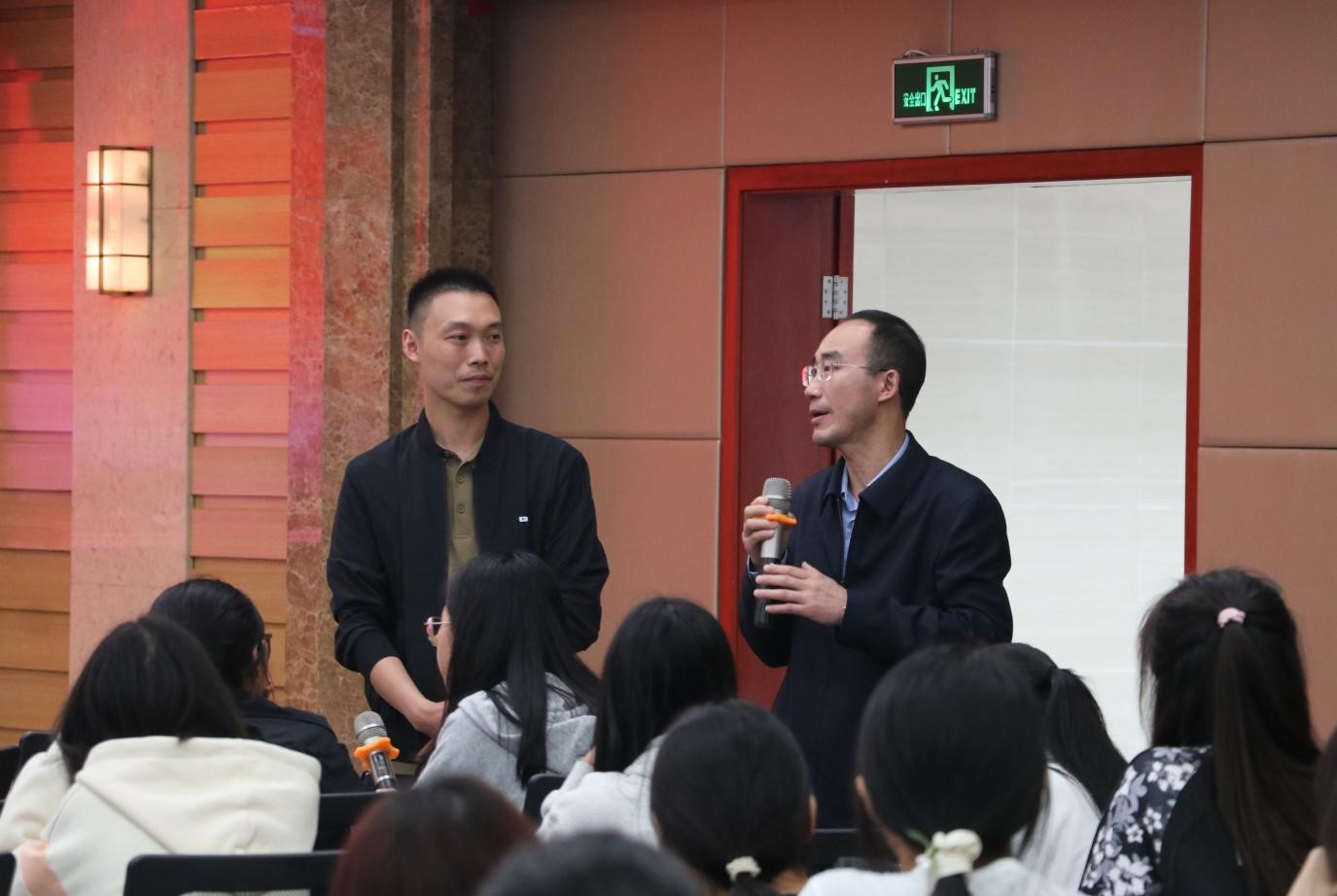 随后,冉崇军老师走下讲台,与同学们展开深入交流。同学们就“优师计划”中学涯、职涯设计,实践实习教学安排等相关问题进行了提问。冉崇军老师从多角度、全方位进行了耐心地解答,帮助同学们更好地从自身职业发展角度出发,慎重思考未来的奋斗路径。现场氛围浓烈,掌声不断。