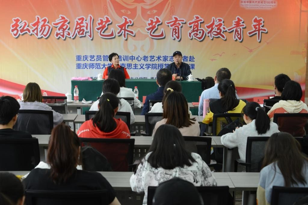 特邀重庆艺员中心文艺志愿艺术团京剧艺术家孙志芳(国家一级演员)、张志凌(国家二级演员)在我校三春湖报告厅讲授艺术思政课。学院党委副书记方敏、学工辅导老师及学生近150人参加。