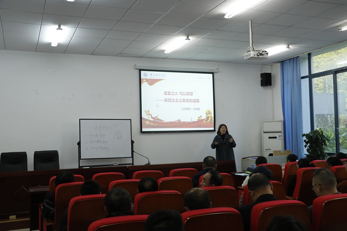 在新进教师公开汇报课环节,学院新进教师陈沉就“哲学的基本问题”进行课程展示。他从世界观与哲学的关系入手,对哲学的基本问题和基本派别进行了讲解。陈沉老师在为同学们传递马克思主义哲学知识的同时,勉励同学们保持对思想的敬畏,要从党的百年奋斗历程中领悟真理,立志为中华民族的伟大复兴而努力学习。随后,新进教师彭君君进行了课程汇报,她通过对中国革命寻路历程的回溯,引导同学们对“新民主主义革命的道路”问题展开探讨,并在清晰地说理与温暖地讲情中,以历史与现实的对照,将“中国应该走什么样的道路,中国为什么要走新民主主义革命道路以及新民主主义革命道路的内容是什么”进行了展示,引导同学们深刻认识到“新时代大学生如何坚定道路自信?如何坚定‘四个自信’?”这两个重要问题。